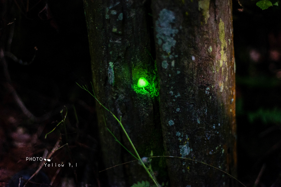 晚上賞螢沒有燈光影響時,眼睛放亮,在路邊的腐木上仔細找找,幸運的話說不定可以發現螢光蕈喔。