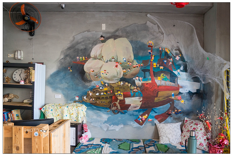 春爸一進到旅店門口立刻就被牆上這面圖給吸引了目光,載滿卡通人物的飛船像是要帶領你進入幻想的世界當中,這一刻開始~忘掉大人的煩惱~回到小時候吧~